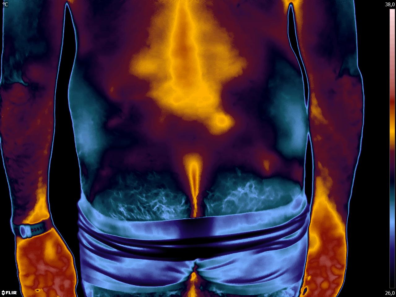 Como no caso do termograma abaixo de um paciente do sexo masculino, 38 anos, sem comorbidades e com relato de dor lombar aguda. Foi realizado uma Análise Termofuncional e detectado alterações térmicas condizentes o relato de dor clínica.
